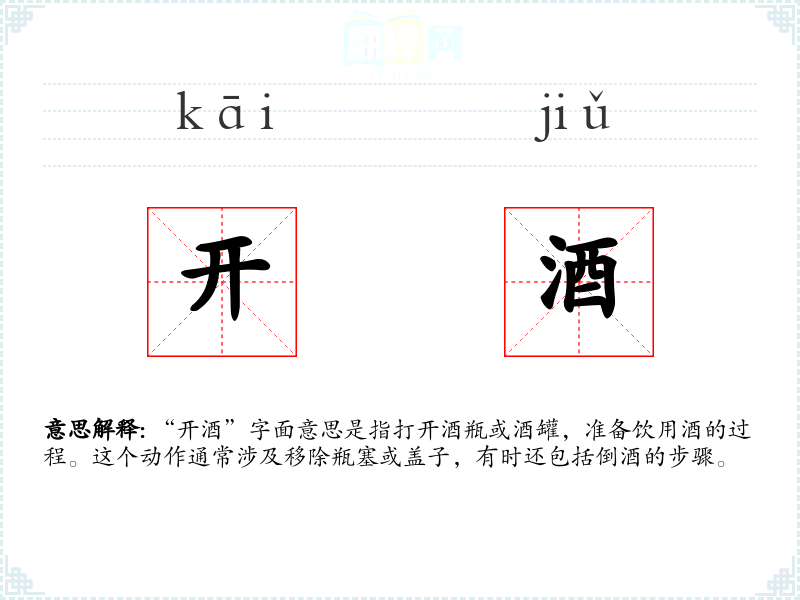 “开酒”字面意思是指打开酒瓶或酒罐,准备饮用酒的过程。这个动作通常涉及移除瓶塞或盖子,有时还包括倒酒的步骤。