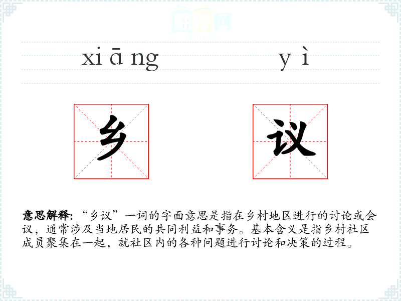 “乡议”一词的字面意思是指在乡村地区进行的讨论或会议,通常涉及当地居民的共同利益和事务。基本含义是指乡村社区成员聚集在一起,就社区内的各种问题进行讨论和决策的过程。