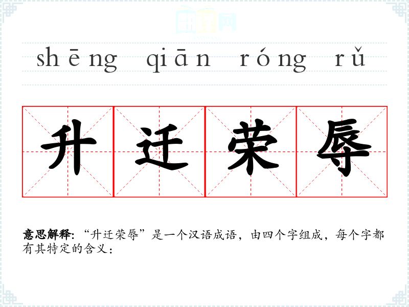“升迁荣辱”是一个汉语成语,由四个字组成,每个字都有其特定的含义: