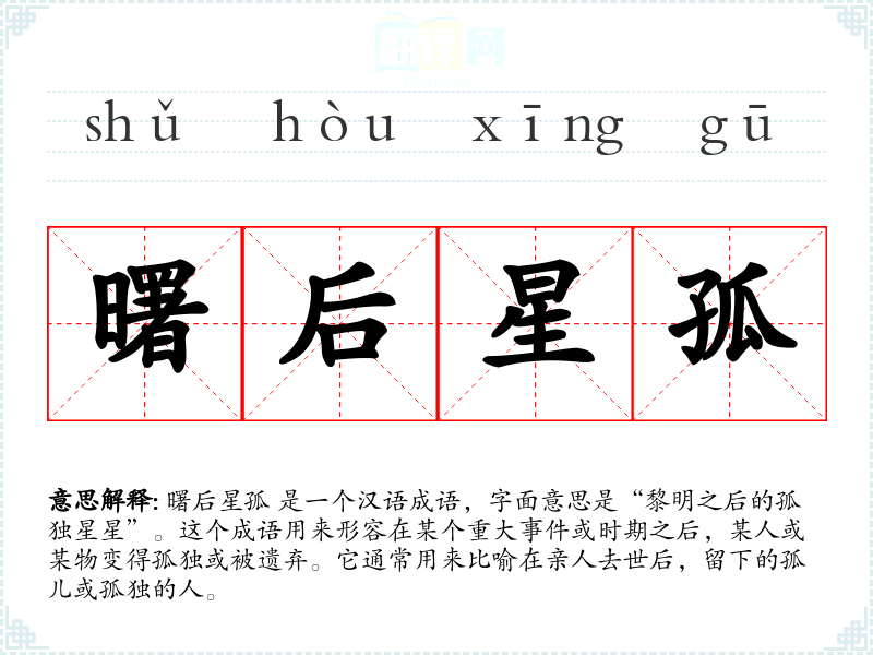 曙后星孤 是一个汉语成语,字面意思是“黎明之后的孤独星星”。这个成语用来形容在某个重大**或时期之后,某人或某物变得孤独或被遗弃。它通常用来比喻在亲人去世后,留下的孤儿或孤独的人。