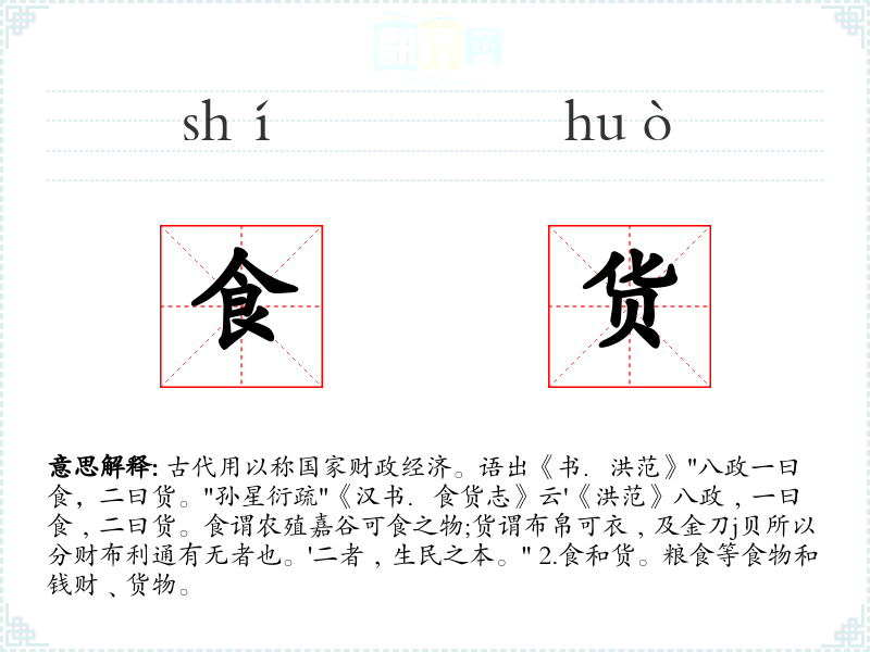 古代用以称国家财政经济。语出《书.洪范》"八政一曰食,二曰货。"孙星衍疏"《汉书.食货志》云'《洪范》八政﹐一曰食﹐二曰货。食谓农殖嘉谷可食之物;货谓布帛可衣﹐及金刀j贝所以分财布利通有无者也。'二者﹐生民之本。" 2.食和货。粮食等食物和钱财﹑货物。