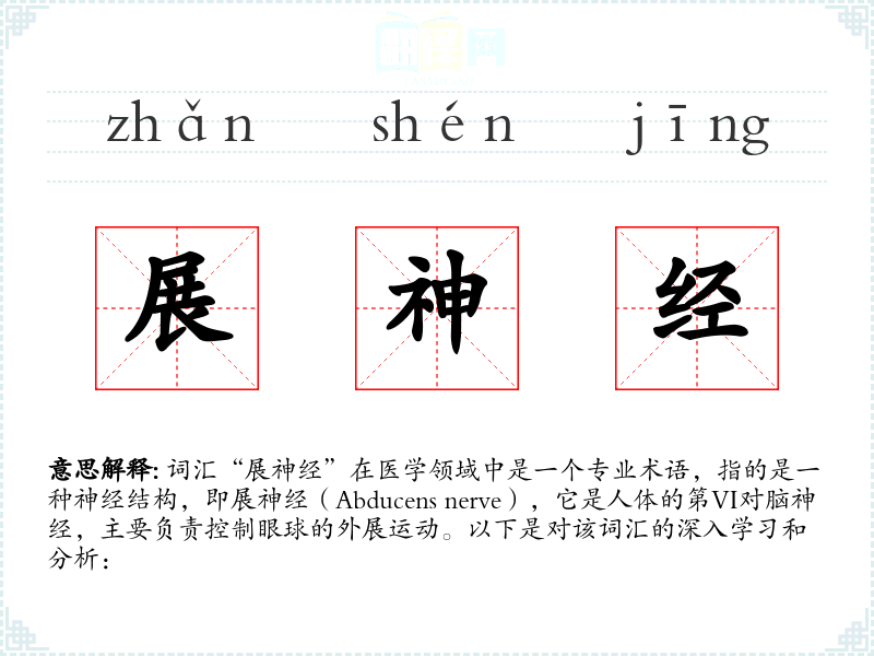 词汇“展神经”在医学领域中是一个专业术语,指的是一种神经结构,即展神经(Abducens nerve),它是人体的第VI对脑神经,主要负责控制眼球的外展*。以下是对该词汇的深入学和分析: