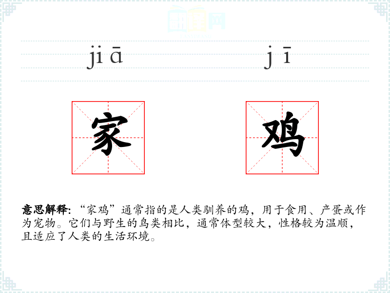 “家鸡”通常指的是人类驯养的鸡,用于食用、产蛋或作为宠物。它们与野生的鸟类相比,通常体型较大,性格较为温顺,且适应了人类的生活环境。