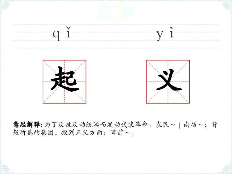为了反抗反动统治而发动武装革命:农民~|南昌~;背叛所属的集团,投到正义方面:阵前~。