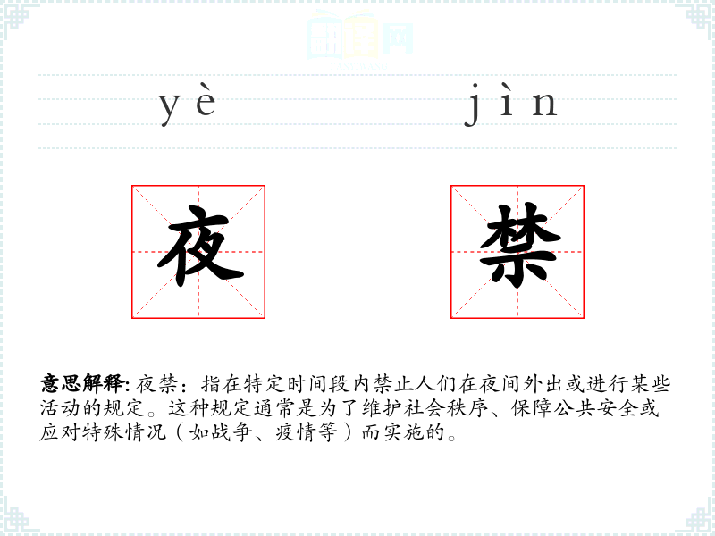 夜禁:指在特定时间段内禁止人们在夜间外出或进行某些活动的规定。这种规定通常是为了维护社会秩序、保障公共安全或应对特殊情况(如战争、疫情等)而实施的。