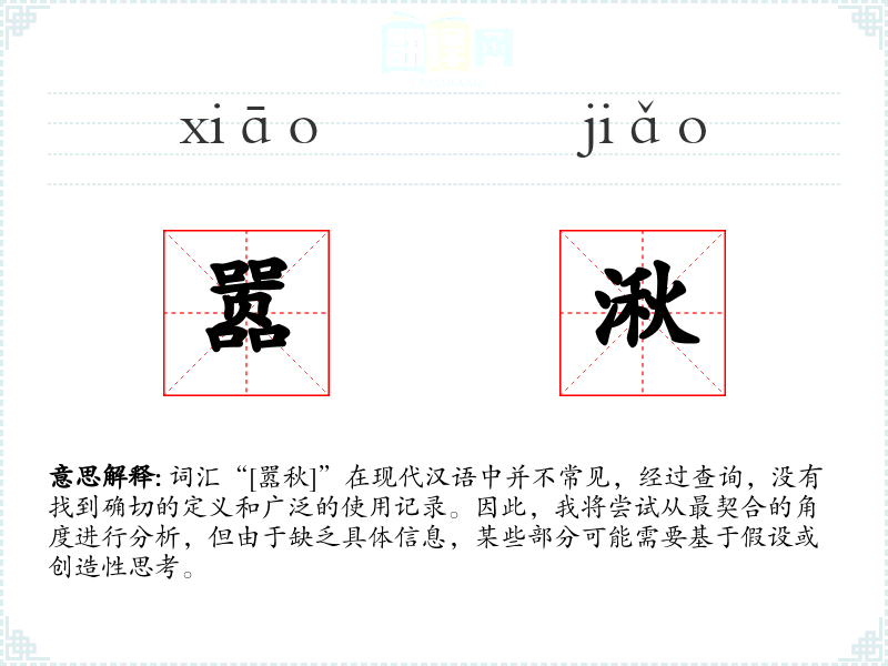 词汇“[嚣秋]”在现代汉语中并不常见,经过查询,没有找到确切的定义和广泛的使用记录。因此,我将尝试从最契合的角度进行分析,但由于缺乏具体信息,某些部分可能需要基于假设或创造性思考。