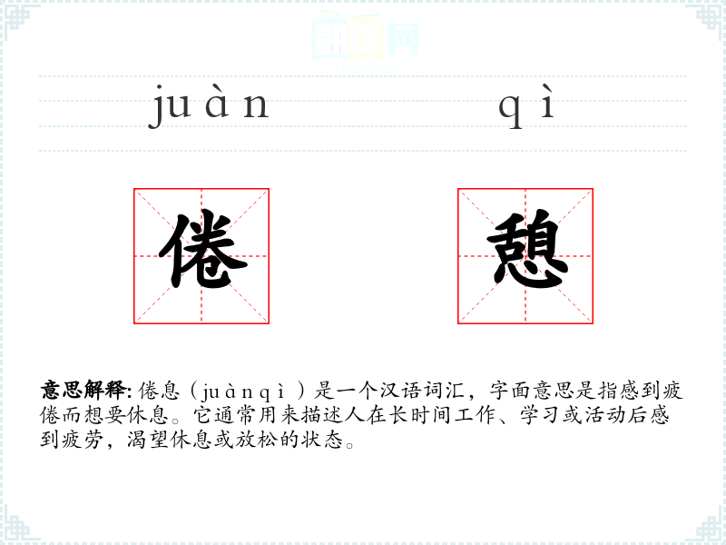 倦息(juàn qì)是一个汉语词汇,字面意思是指感到疲倦而想要休息。它通常用来描述人在长时间工作、学*或活动后感到疲劳,渴望休息或放松的状态。