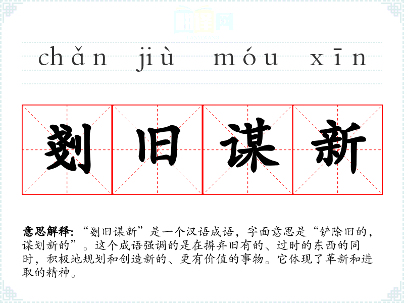 “剗旧谋新”是一个汉语成语,字面意思是“铲除旧的,谋划新的”。这个成语强调的是在摒弃旧有的、过时的东西的同时,积极地规划和创造新的、更有价值的事物。它体现了革新和进取的精神。