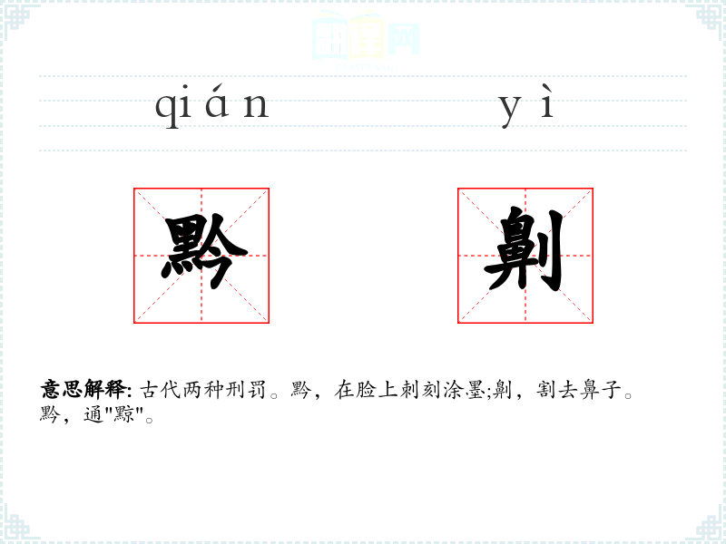 古代两种刑罚。黔,在脸上刺刻涂墨;劓,割去鼻子。黔,通"黥"。