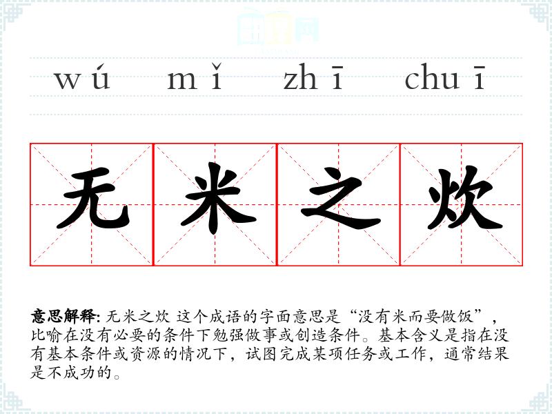 无米之炊 这个成语的字面意思是“没有米而要做饭”,比喻在没有必要的条件下勉强做事或创造条件。基本含义是指在没有基本条件或资源的情况下,试图完成某项任务或工作,通常结果是不成功的。
