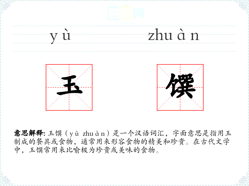 玉馔(yù zhuàn)是一个汉语词汇,字面意思是指用玉制成的餐具或食物,通常用来形容食物的精美和珍贵。在古代文学中,玉馔常用来比喻极为珍贵或美味的食物。