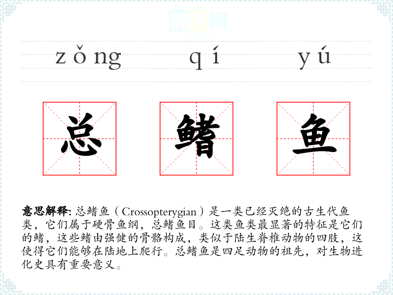 - 同义词:四足鱼(Tetrapodomorph),指的是一类与总鳍鱼相近的鱼类,它们也具有向陆生生活过渡的特征。