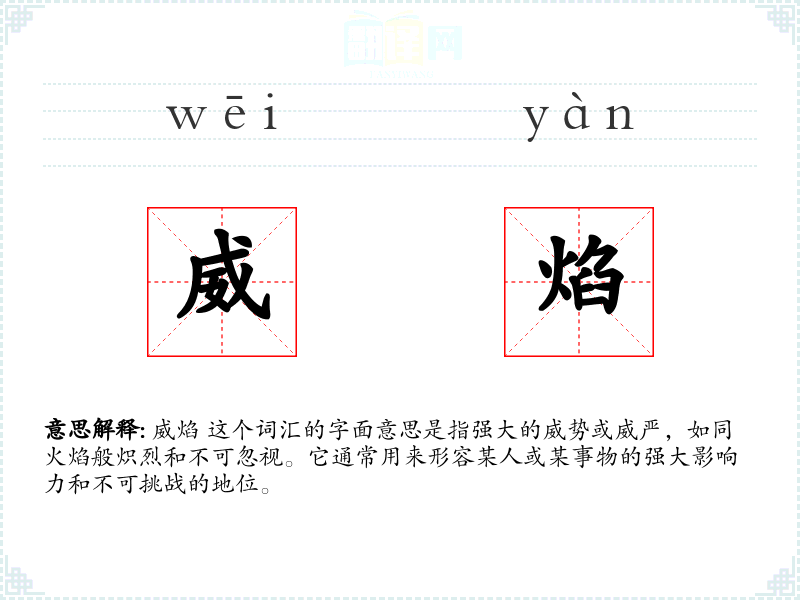 威焰 这个词源于汉语,由“威”和“焰”两个字组成。在古代汉语中,“威”指力量或影响力,“焰”指火焰。随着时间的推移,这个词的含义逐渐固定为形容强大的影响力和威严。