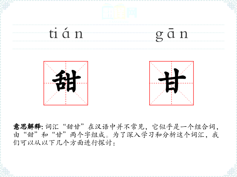 “甜”通常指的是味道像糖或蜜一样的感觉,而“甘”也有类似的意思,指的是味道甜美。因此,“甜甘”可以理解为强调甜味的词汇,可能用于描述食物、饮料或其他具有甜美特质的物品。