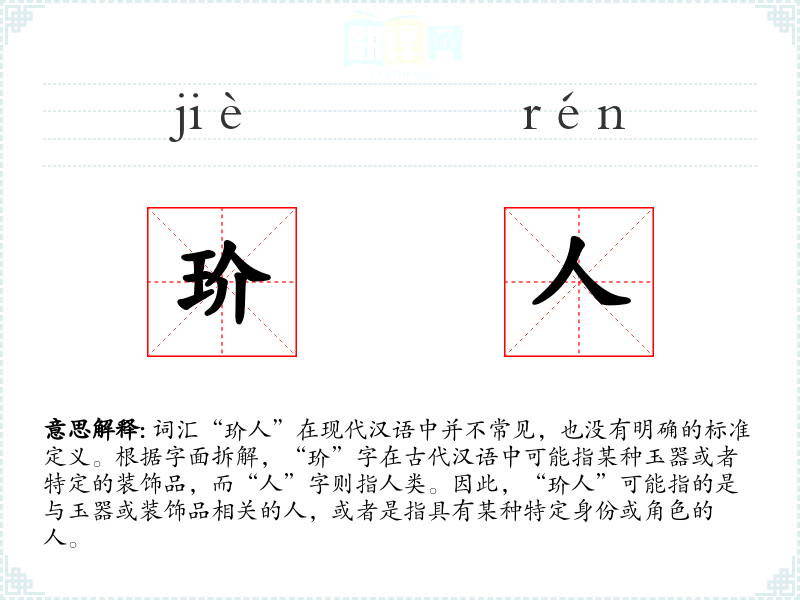 词汇“玠人”在现代汉语中并不常见,也没有明确的标准定义。根据字面拆解,“玠”字在古代汉语中可能指某种玉器或者特定的装饰品,而“人”字则指人类。因此,“玠人”可能指的是与玉器或装饰品相关的人,或者是指具有某种特定身份或角色的人。
