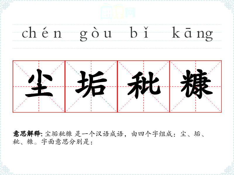 尘垢秕糠 是一个汉语成语,由四个字组成:尘、垢、秕、糠。字面意思分别是: