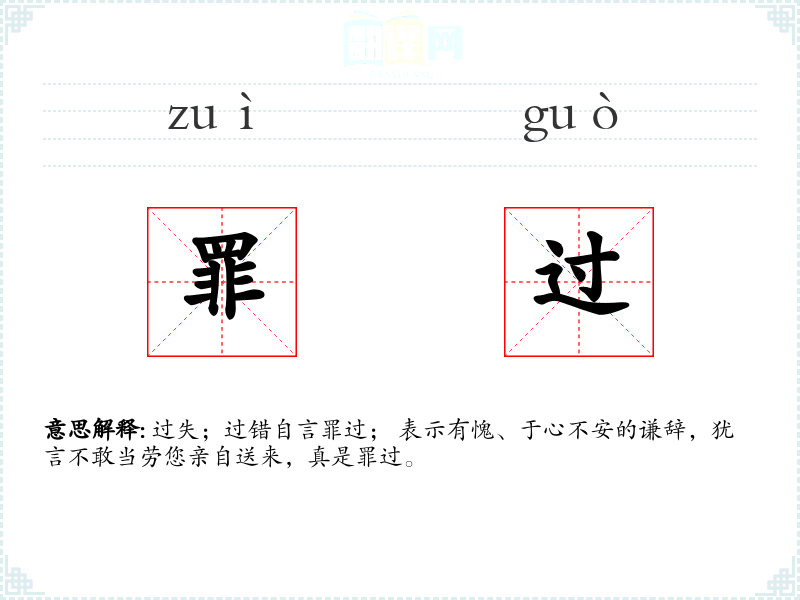 过失;过错自言罪过; 表示有愧、于心不安的谦辞,犹言不敢当劳您亲自送来,真是罪过。