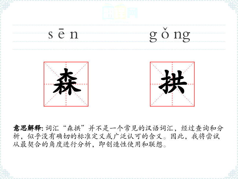 词汇“森拱”并不是一个常见的汉语词汇,经过查询和分析,似乎没有确切的标准定义或广泛认可的含义。因此,我将尝试从最契合的角度进行分析,即创造性使用和联想。