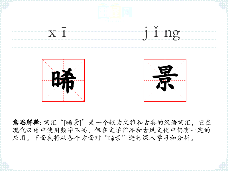 词汇“[晞景]”是一个较为文雅和古典的汉语词汇,它在现代汉语中使用频率不高,但在文学作品和古风文化中仍有一定的应用。下面我将从各个方面对“晞景”进行深入学*和分析。