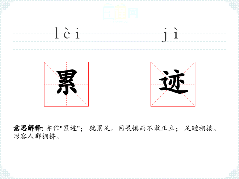 亦作"累迹"; 犹累足。因畏惧而不敢正立; 足踵相接。形容人群拥挤。