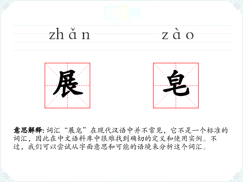 词汇“展皂”在现代汉语中并不常见,它不是一个标准的词汇,因此在中文语料库中很难找到确切的定义和使用实例。不过,我们可以尝试从字面意思和可能的语境来分析这个词汇。