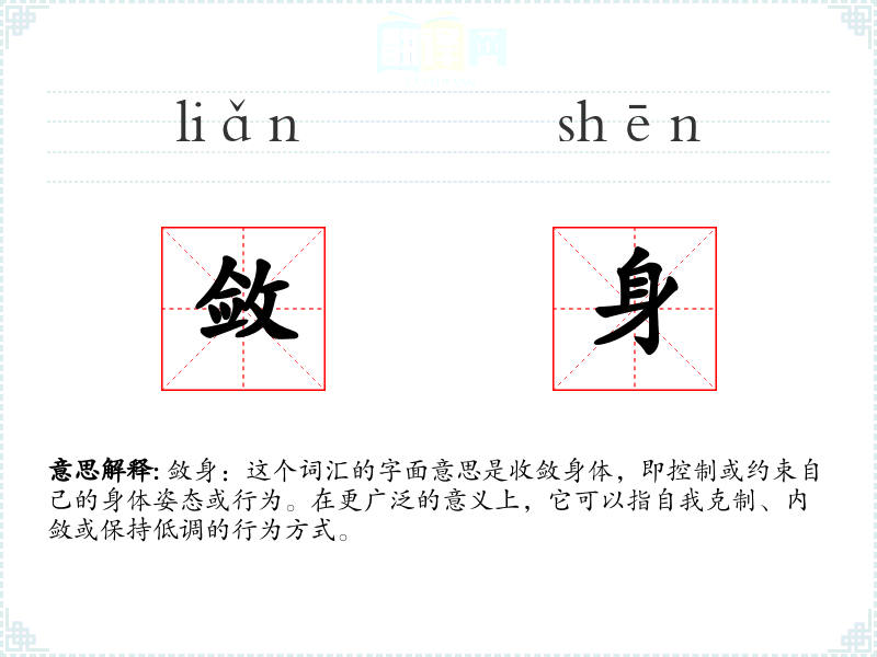敛身:这个词汇的字面意思是收敛身体,即控制或约束自己的身体姿态或行为。在更广泛的意义上,它可以指自我克制、内敛或保持低调的行为方式。
