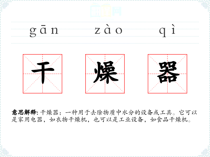 干燥器:一种用于去除物质中水分的设备或工具。它可以是家用电器,如衣物干燥机,也可以是工业设备,如食品干燥机。