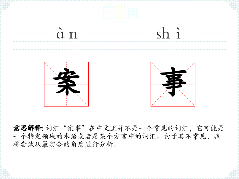 - 反义词:(由于“案事”不是一个常用词汇,反义词可能不明显)