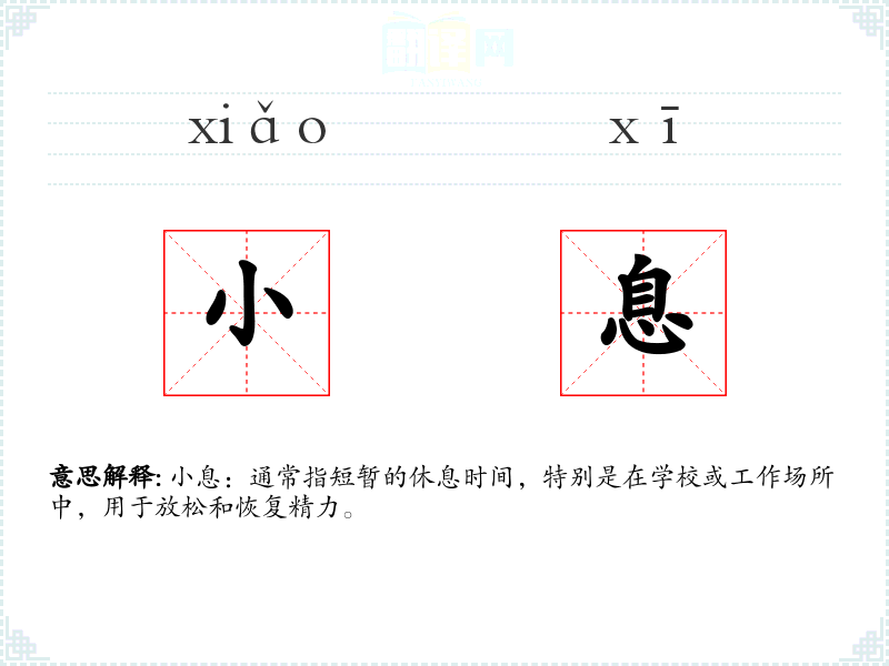 小息:通常指短暂的休息时间,特别是在学校或工作场所中,用于放松和恢复精力。