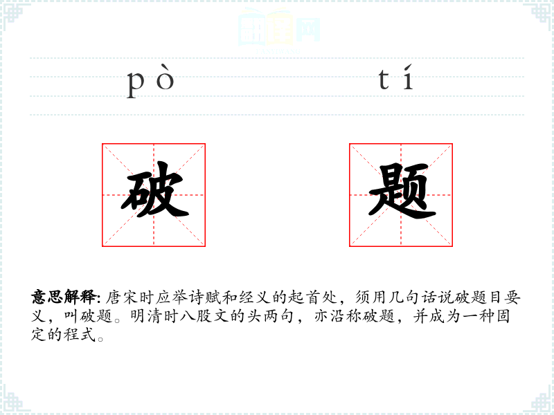 唐宋时应举诗赋和经义的起首处,须用几句话说破题目要义,叫破题。明清时八股文的头两句,亦沿称破题,并成为一种固定的程式。