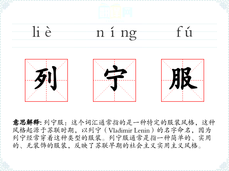 列宁服:这个词汇通常指的是一种特定的服装风格,这种风格起源于苏联时期,以列宁(Vladimir Lenin)的名字命名,因为列宁经常穿着这种类型的服装。列宁服通常是指一种简单的、实用的、无装饰的服装,反映了苏联早期的社会主义实用主义风格。