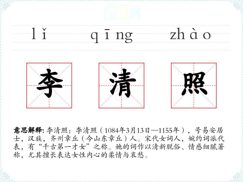 “李清照”这个名字本身没有复杂的词源,但它代表了一个时代的文学成就和个人风格。随着时间的推移,李清照的作品和形象在文学史上留下了深刻的印记。