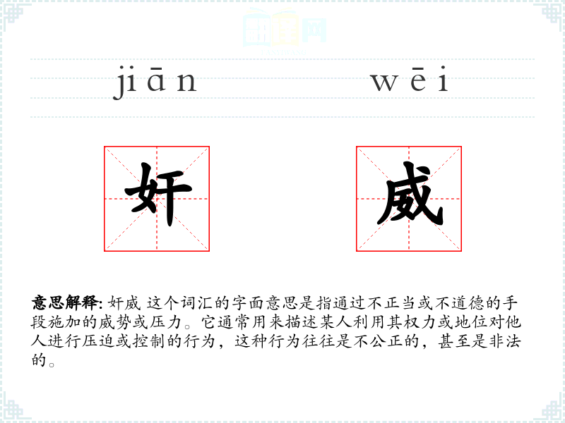 奸威 这个词汇的字面意思是指通过不正当或不道德的手段施加的威势或压力。它通常用来描述某人利用其权力或地位对他人进行压迫或控制的行为,这种行为往往是不公正的,甚至是非法的。