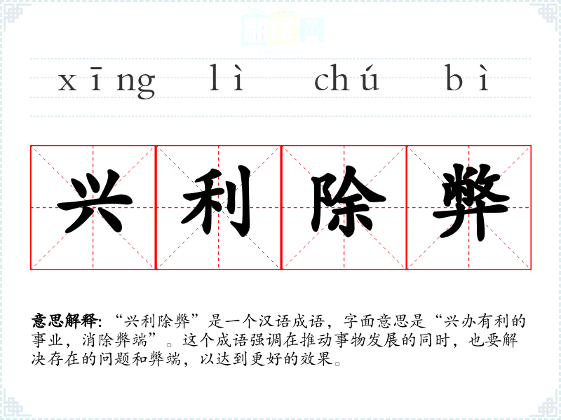 “兴利除弊”是一个汉语成语,字面意思是“兴办有利的事业,消除弊端”。这个成语强调在推动事物发展的同时,也要解决存在的问题和弊端,以达到更好的效果。