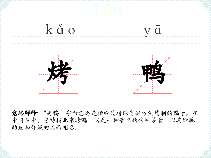 “烤鸭”字面意思是指经过特殊烹饪方法烤制的鸭子。在**菜中,它特指北京烤鸭,这是一种著名的传统菜肴,以其酥脆的皮和鲜嫩的肉而闻名。