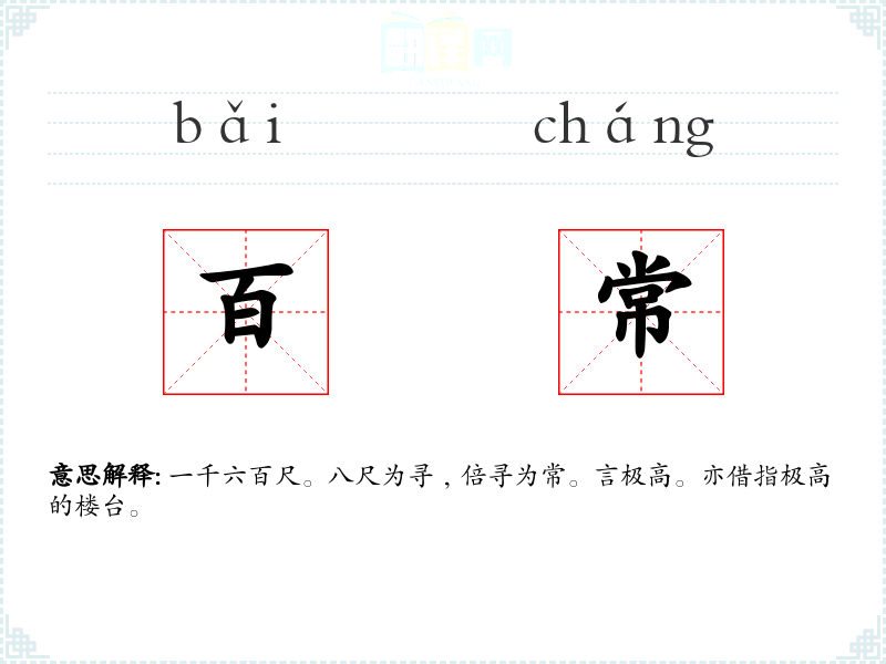 一千六百尺。八尺为寻﹐倍寻为常。言极高。亦借指极高的楼台。