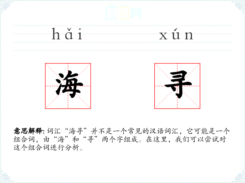 词汇“海寻”并不是一个常见的汉语词汇,它可能是一个组合词,由“海”和“寻”两个字组成。在这里,我们可以尝试对这个组合词进行分析。