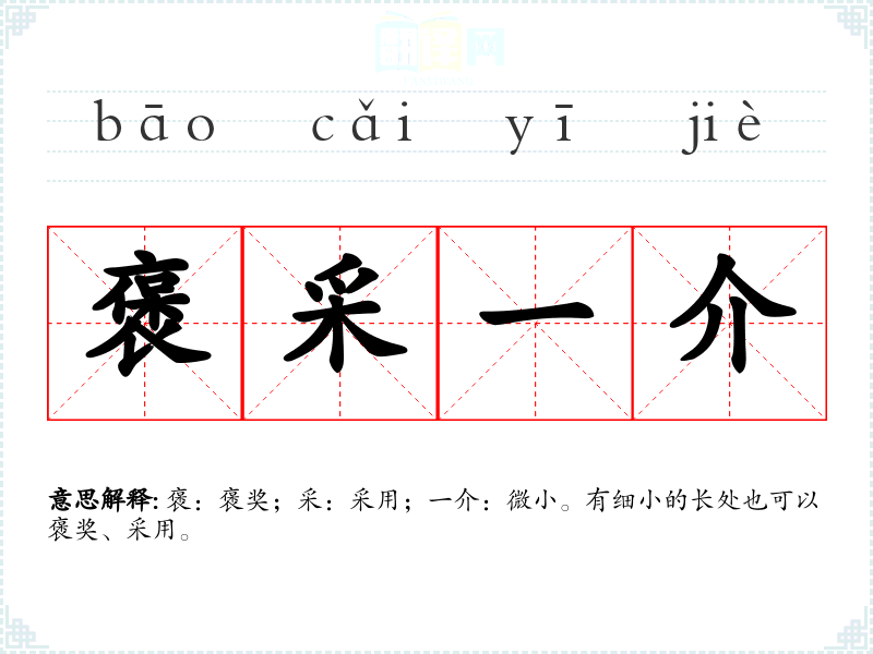 褒:褒奖;采:采用;一介:微小。有细小的长处也可以褒奖、采用。
