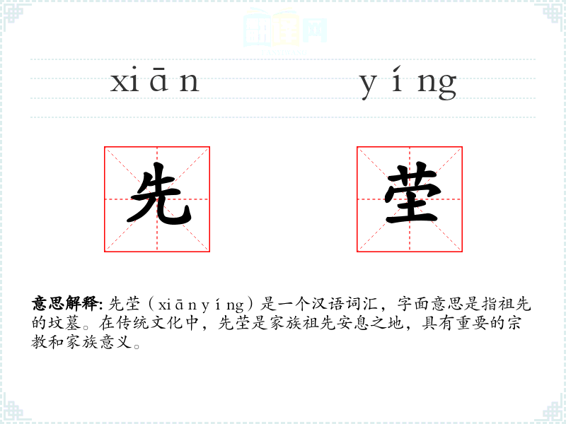 先茔(xiān yíng)是一个汉语词汇,字面意思是指祖先的坟墓。在传统文化中,先茔是家族祖先安息之地,具有重要的**和家族意义。