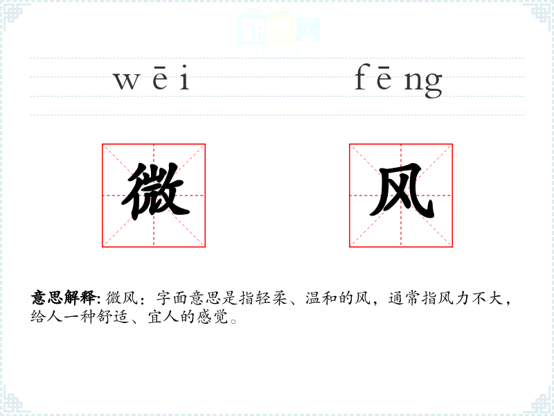 微风:字面意思是指轻柔、温和的风,通常指风力不大,给人一种舒适、宜人的感觉。