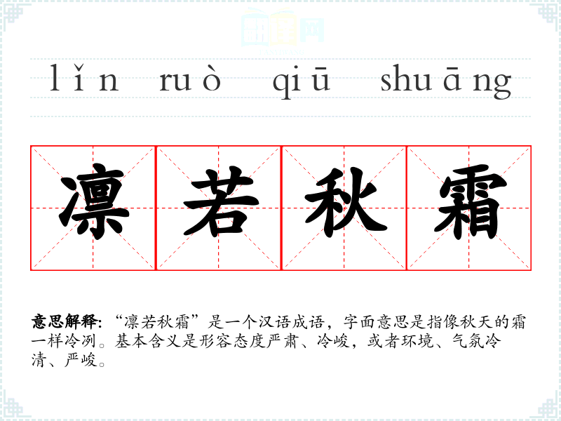 “凛若秋霜”是一个汉语成语,字面意思是指像秋天的霜一样冷冽。基本含义是形容态度严肃、冷峻,或者环境、气氛冷清、严峻。
