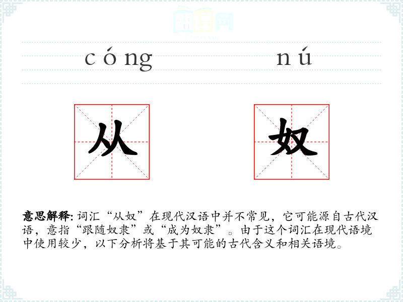 词汇“从奴”在现代汉语中并不常见,它可能源自古代汉语,意指“跟随奴隶”或“成为奴隶”。由于这个词汇在现代语境中使用较少,以下分析将基于其可能的古代含义和相关语境。