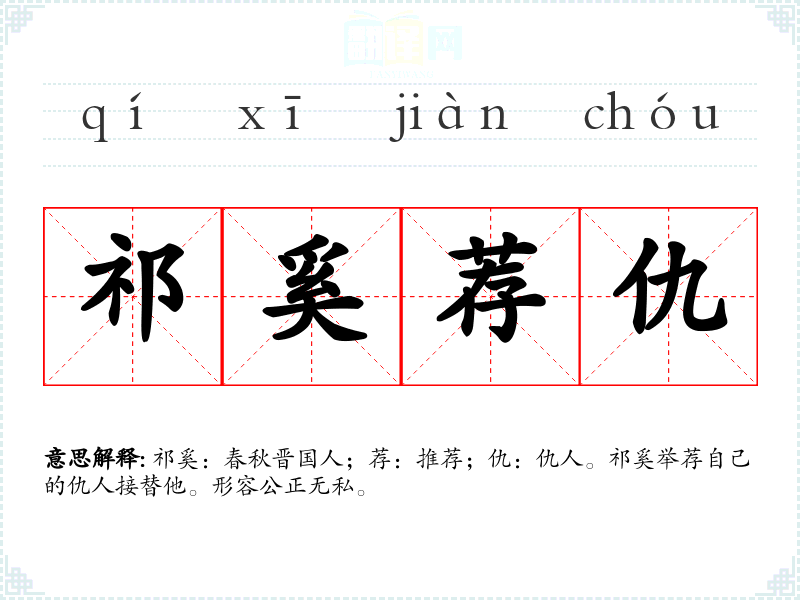祁奚:春秋晋国人;荐:推荐;仇:仇人。祁奚举荐自己的仇人接替他。形容