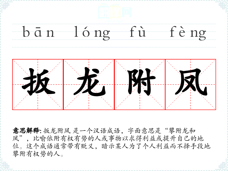 扳龙附凤 是一个汉语成语,字面意思是“攀附龙和凤”,比喻依附有权有势的人或事物以求得利益或提升自己的地位。这个成语通常带有贬义,暗示某人为了个人利益而不择手段地攀附有权势的人。