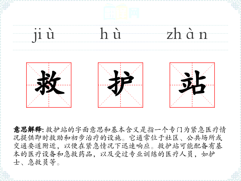 - 反义词:无(因为救护站是一个特定的紧急医疗服务设施,没有直接的反义词)