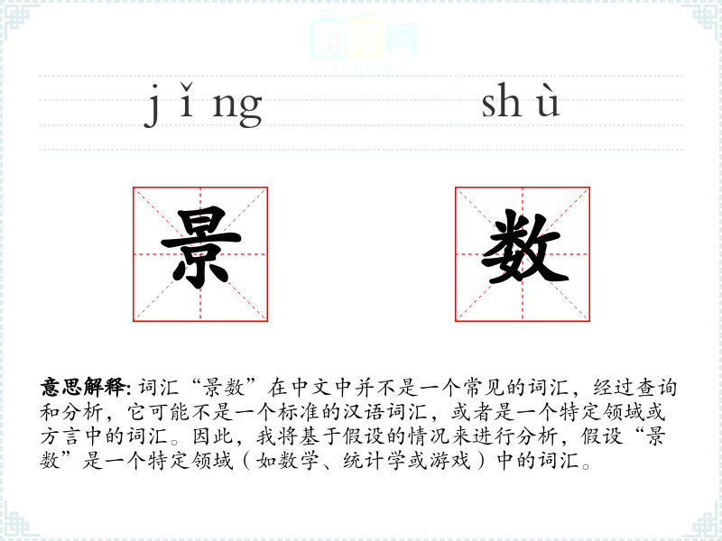 词汇“景数”在中文中并不是一个常见的词汇,经过查询和分析,它可能不是一个标准的汉语词汇,或者是一个特定领域或方言中的词汇。因此,我将基于假设的情况来进行分析,假设“景数”是一个特定领域(如数学、统计学或游戏)中的词汇。