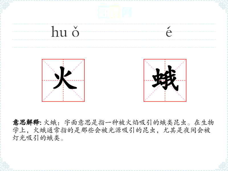 火蛾:字面意思是指一种被火焰吸引的蛾类昆虫。在生物学上,火蛾通常指的是那些会被光源吸引的昆虫,尤其是夜间会被灯光吸引的蛾类。