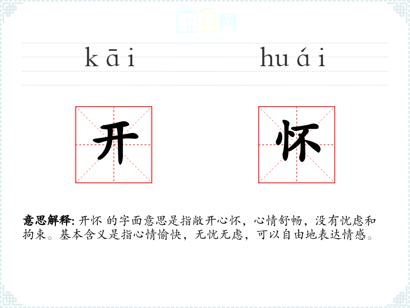 开怀 的字面意思是指敞开心怀,心情舒畅,没有忧虑和拘束。基本含义是指心情愉快,无忧无虑,可以自由地表达情感。