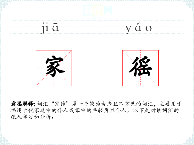 “家僮”一词虽然在现代不常用,但它反映了古代家庭结构和社会阶层的重要方面。了解这一词汇有助于更好地理解历史和文化背景,并在语言学*和表达中增加深度和广度。