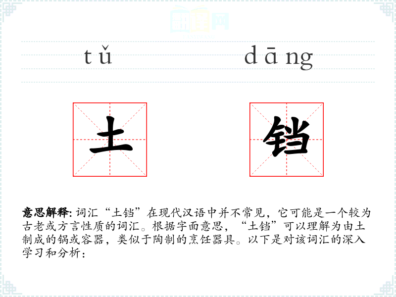 词汇“土铛”在现代汉语中并不常见,它可能是一个较为古老或方言性质的词汇。根据字面意思,“土铛”可以理解为由土制成的锅或容器,类似于陶制的烹饪器具。以下是对该词汇的深入学习和分析: